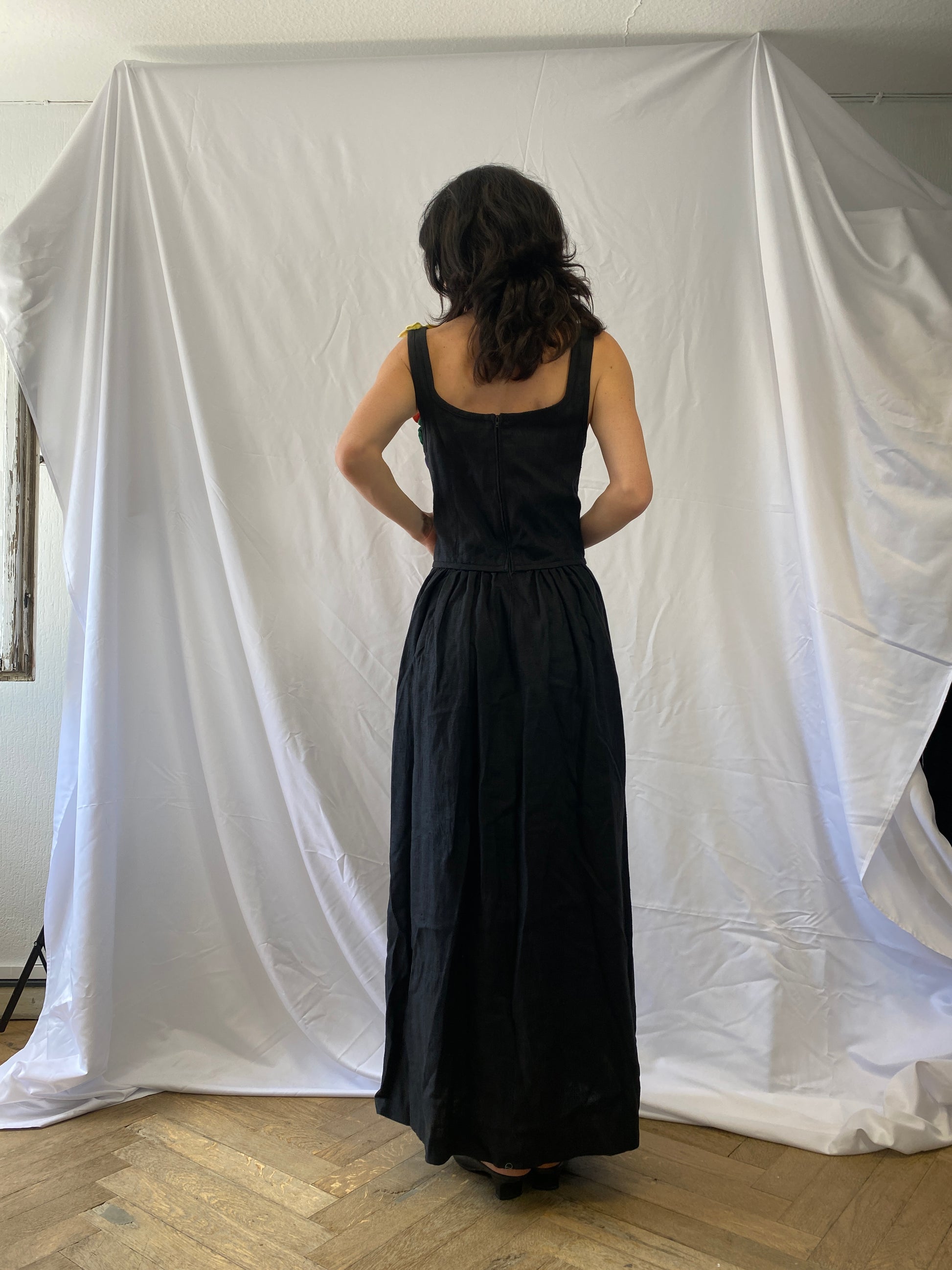 Leinen Maxikleid mit Blumen-Applikation, das am Torso eng anliegt und ab der Taille fließend und leicht ausgestellt fällt.