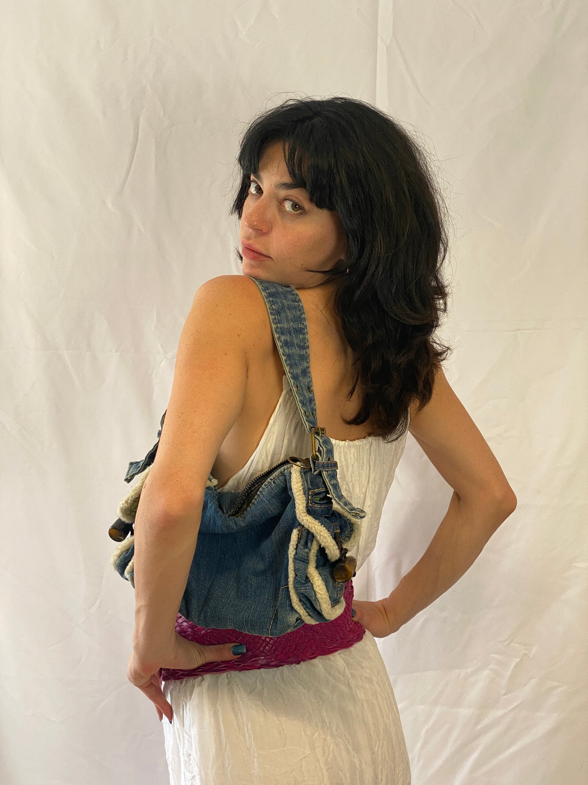 Tasche im Jeans-Look mit Fell Verzierung. Der Henkel ist verstellbar, zum verschließen der Tasche dient ein Reißverschluss. Seitlich befinden sich zwei kleine Taschen mit einem künstlichen Horn.