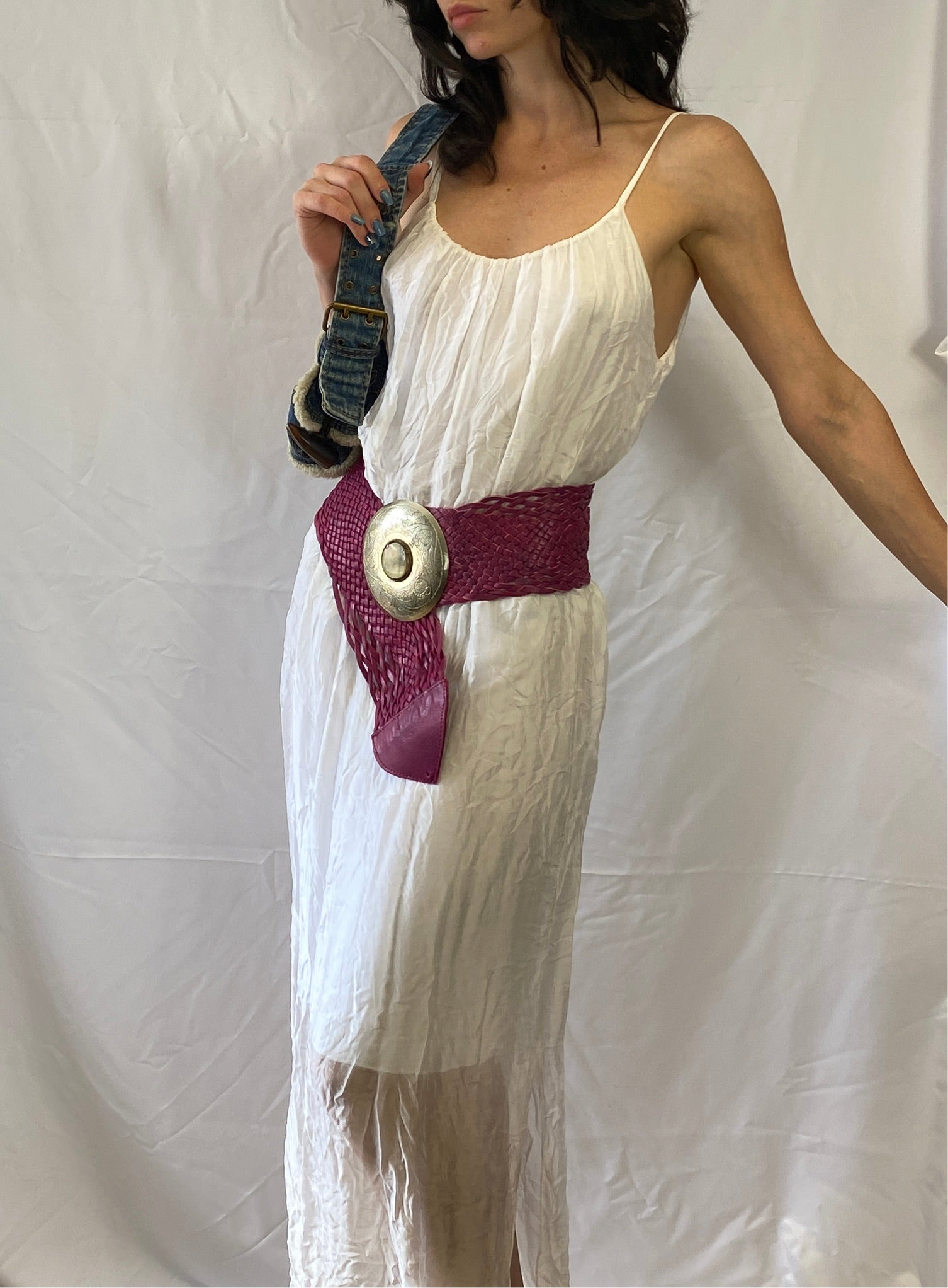 Geflochtener Gürtel aus Leder mit einer großen silbernen runden Schnalle und eingefasstem Stein.